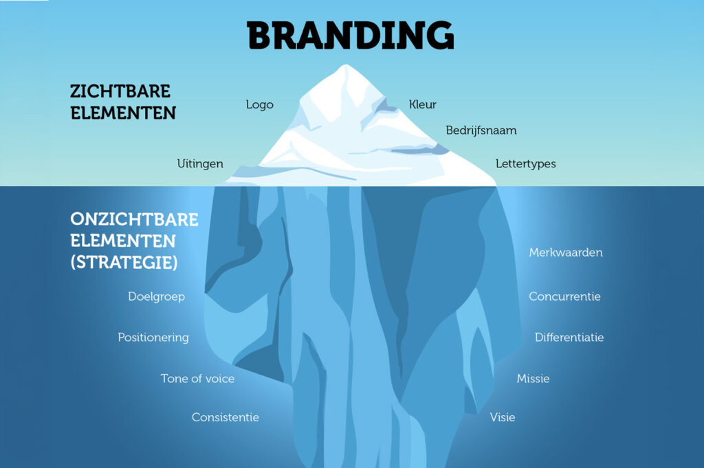 Laten we een veelgemaakte vergissing rechtzetten: branding is geen ander woord voor vormgeving. Je logo is slechts het zichtbare topje van de ijsberg.